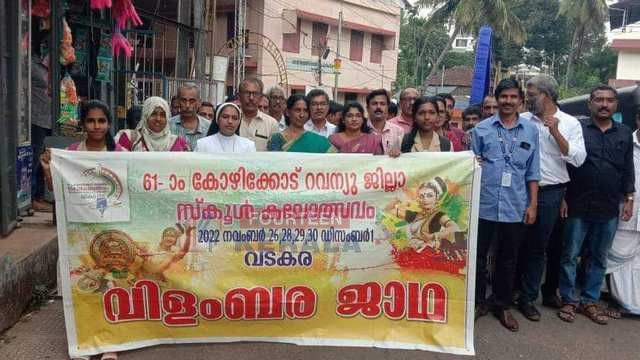 വടകര: നവംബർ 26 മുതൽ ഡിസംബർ ഒന്ന് വരെ നടക്കുന്ന റവന്യൂ ജില്ലാ സ്കൂൾ കലോത്സവത്തിന്റെ ഭാഗമായി വടകരയിൽ വിളംബര ജാഥ നടത്തി. വടകര സെന്റ് ആന്റണീസ് ഗേൾസ് ഹൈസ്കൂളിൽ നിന്നും ആരംഭിച്ച വിളംബര ജാഥ പുതിയ ബസ് സ്റ്റാൻഡ് പരിസരത്ത് സമാപിച്ചു.