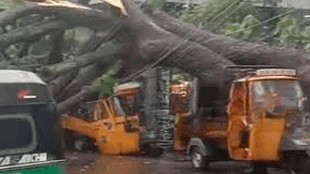 തൃശ്ശൂർ നഗരത്തിൽ വൻമരം കടപുഴകി വീണു; ഓട്ടോറിക്ഷകൾ തകർന്നു, ഗതാഗതക്കുരുക്ക്