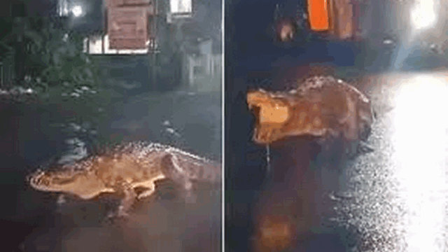 കനത്ത മഴയിൽ റോഡിലെത്തിയത് എട്ട് അടിയോളം നീളമുള്ള മുതല