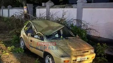 കനത്ത കാറ്റിലും ശക്തമായ മഴയിലും മരം ഒടിഞ്ഞുവീണ് കാർ തകർന്നു